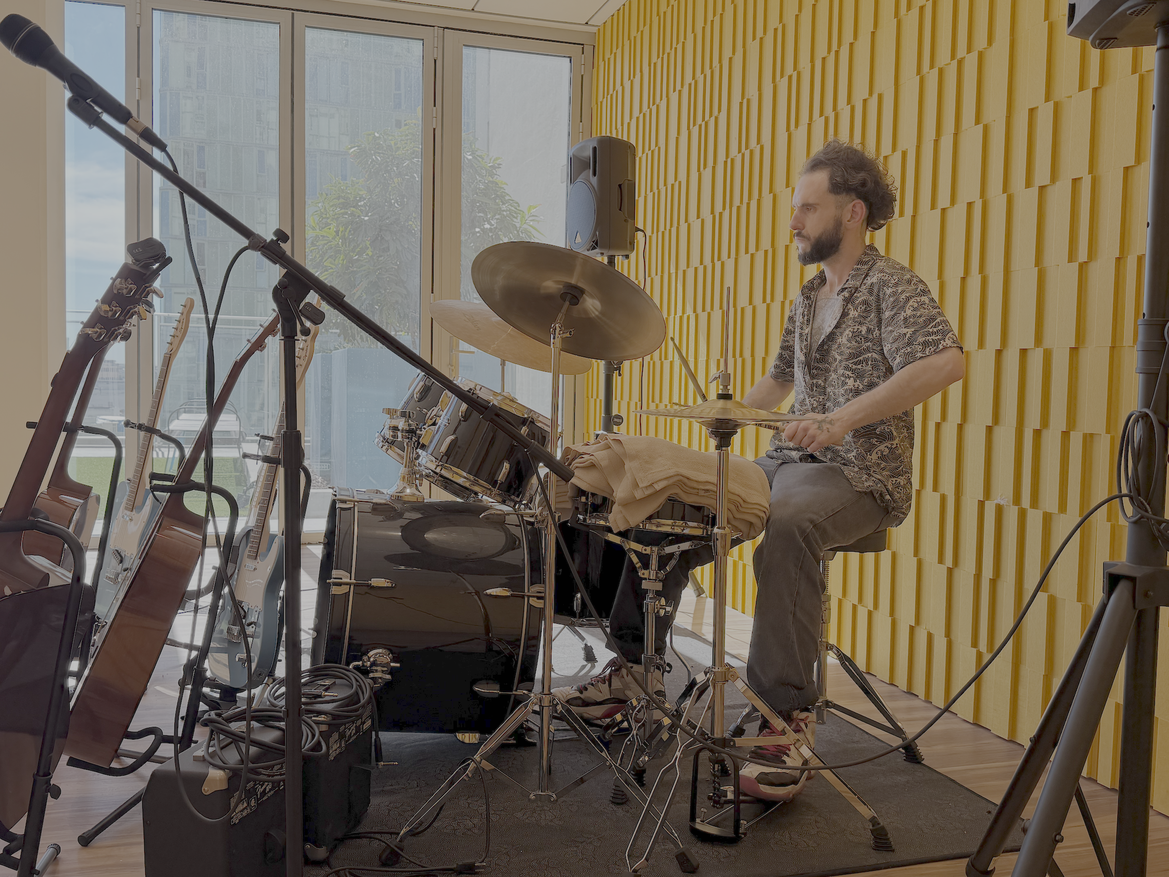 Weingart Tower 1 resident, Ian takes part in a group session by using a drum kit.