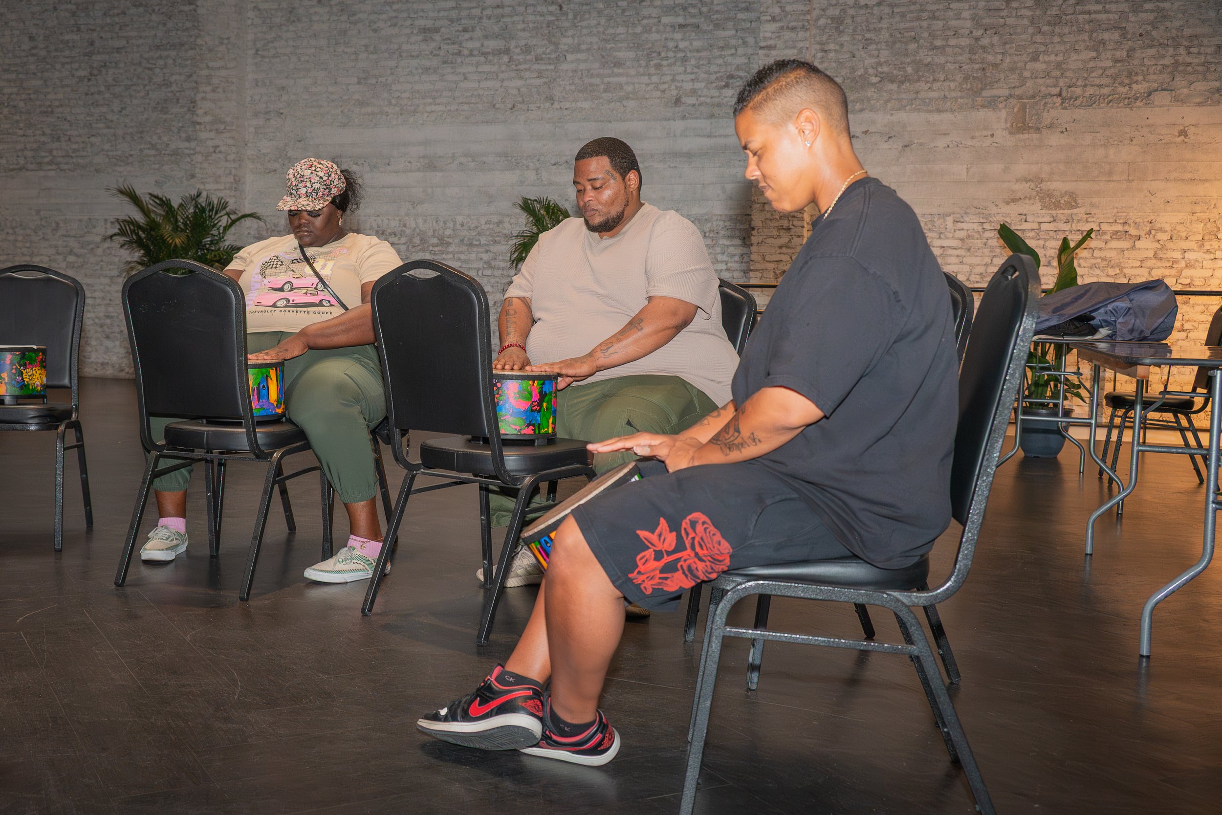In both group and one‑on‑one sessions, DFYL facilitators use drumming and visualization exercises built around ten core character values: Trust, Responsibility, Justice, Loyalty, Honesty, Self‑Discipline, Survival, Character, Respect, and Independence. These sessions are trauma‑informed, low‑barrier, and do not require any musical experience—participants can simply show up, pick up a drum, and join at their own pace.